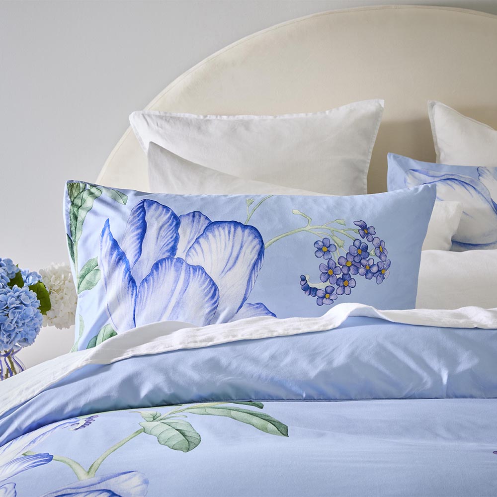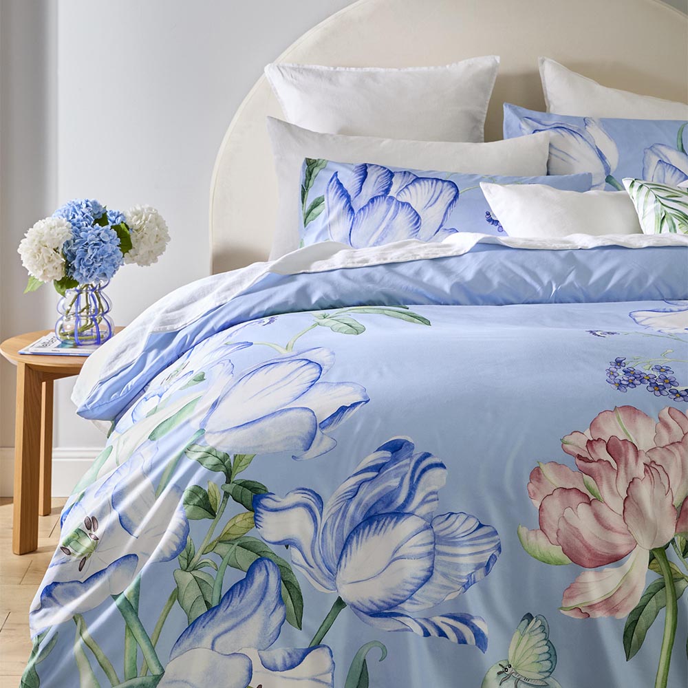 The Adorn Living® Clara Quilt Cover Set features a beautiful watercolour floral design on soft blue backdrop, showcasing elegant tulips, peonies, and delicate forget-me-nots with green foliage and butterfly accents. Available in sizes ranging from Queen to Super King sizes with a matching cushion also available (sold separately). This quilt cover set pairs beautifully with complementary bed sheets, throws, cushions, and blankets from Adorn Living® for a complete bedroom ensemble. Shop Adorn Living® for more bed linen including bed sheets, pillowcases, throws, blankets, and cushions.
