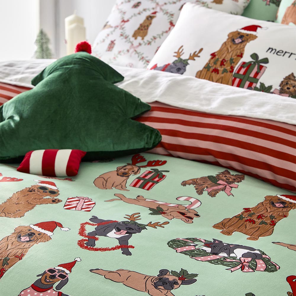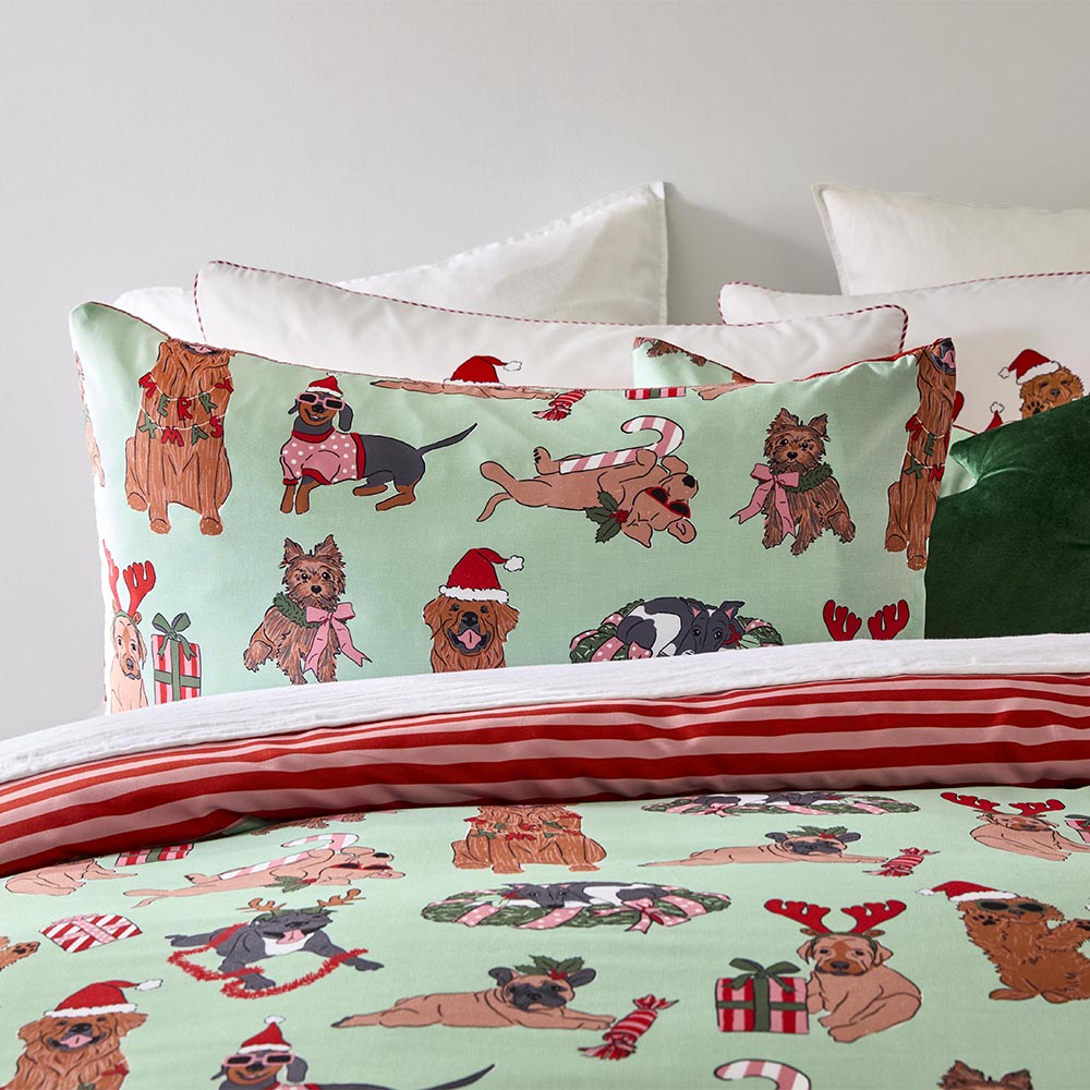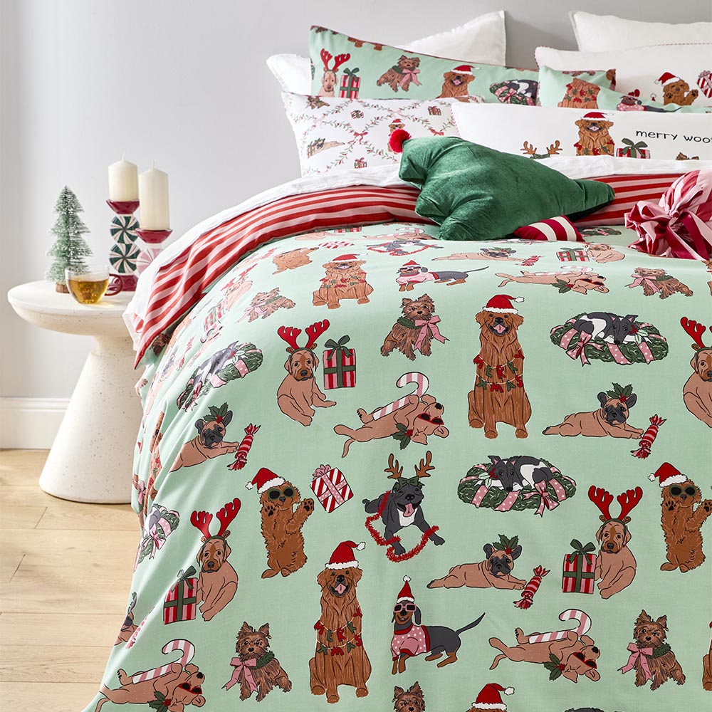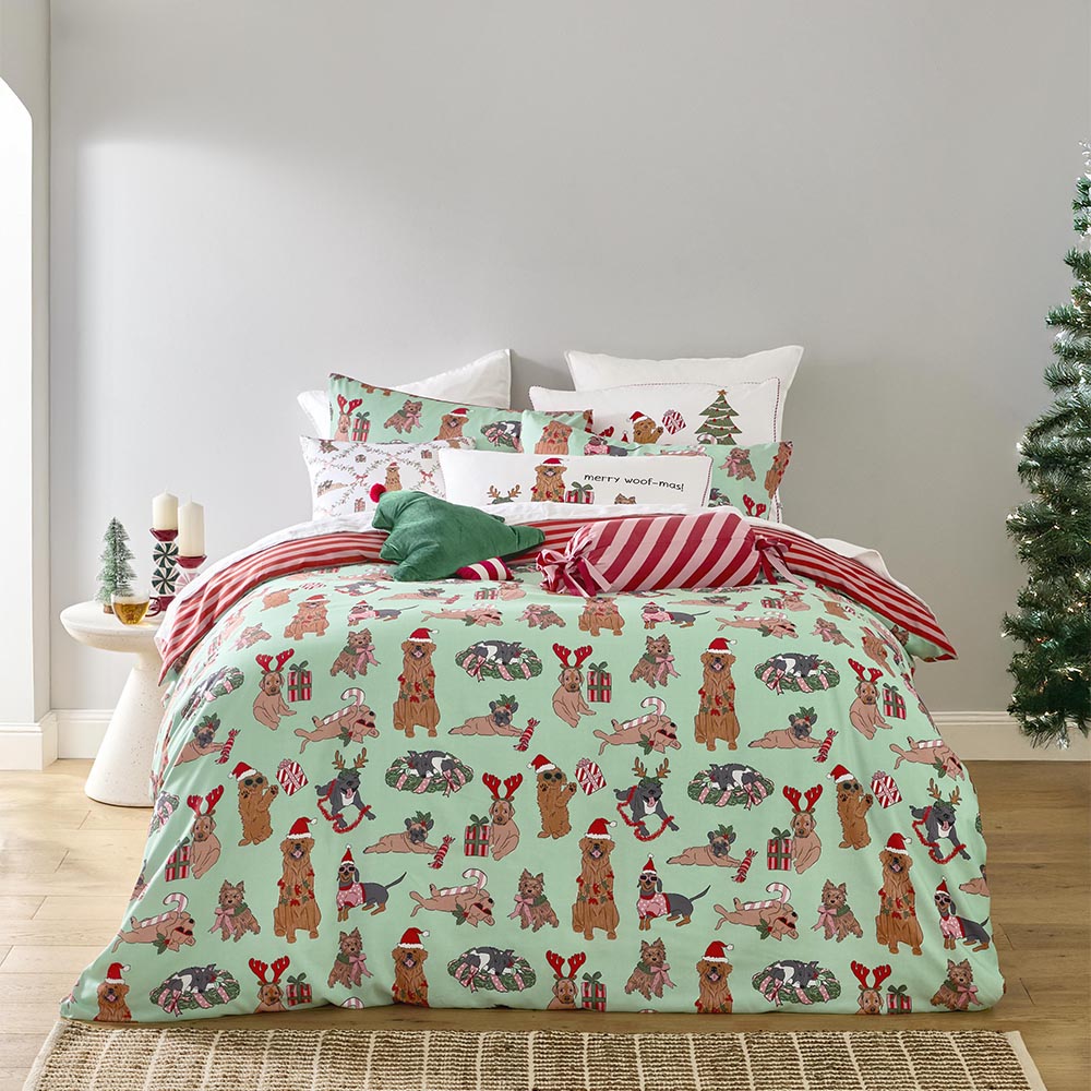The Adorn Living® Xmas Dogs Quilt Cover Set features adorable festive pups in Santa hats, reindeer antlers, and Christmas scarves on a charming mint green background with red striped reverse. Crafted from premium materials for lasting softness and durability, this delightful set includes one quilt cover and two pillowcases. Available from Single to King, with matching cushion sold separately. Shop Adorn Living® for more bed linen including bed sheets, pillowcases, cushions, throws, and blankets.