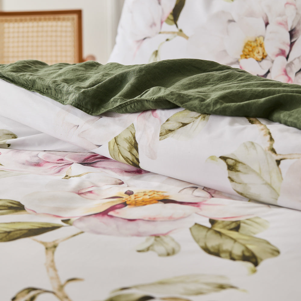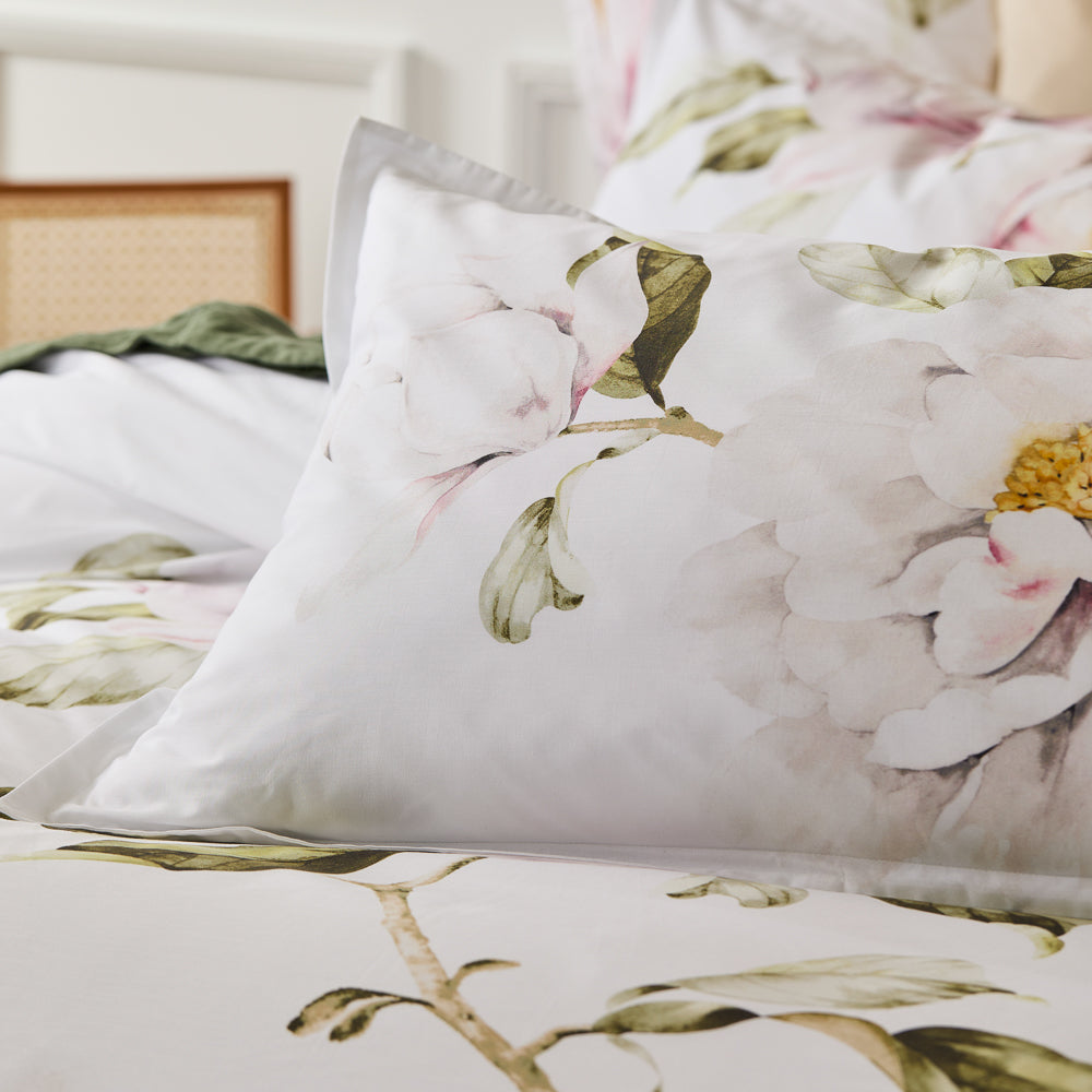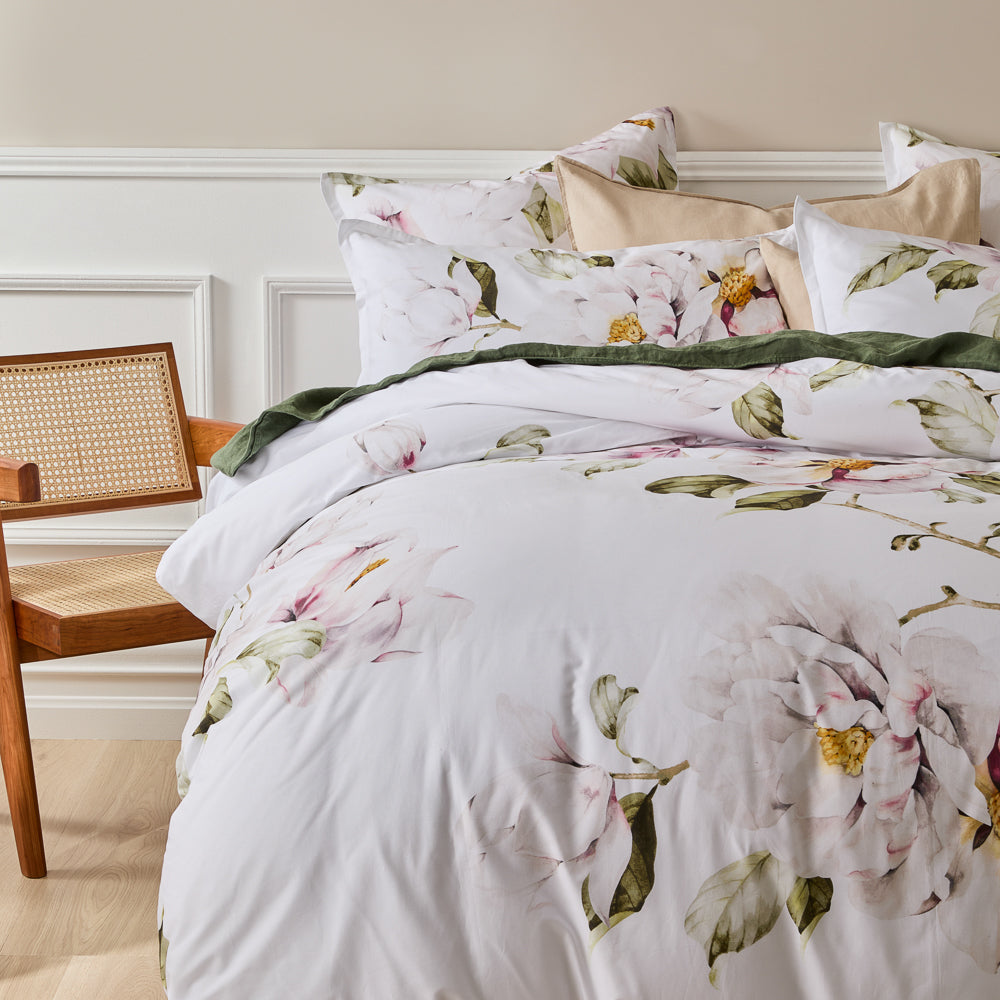 The Amour Quilt Cover Set is a stunning addition to your bedding collection. This beautiful quilt cover set features a delicate floral design, hand-painted by local Australian artists. Hints of pink and green add a subtle drop of colour atop the clean white backdrop. Printed onto luxurious cotton sateen, this set offers a comfortable and indulgent feel for a restful night's sleep. The intricate detail of the artwork is showcased in the design, which boasts a 2 cm flange edge for a touch of sophistication and style. The reverse side of the quilt cover is a plain, white-coloured cotton percale, offering a clean and fresh aesthetic. The Amour Quilt Cover Set is a versatile and timeless design that will complement any bedroom decor. Style it with its coordinating European pillowcase for a classic look or mix and match with other bedding collections to create a unique and personalised space. Bring an air of soft and graceful elegance to your bedroom with the Amour Quilt Cover Set.