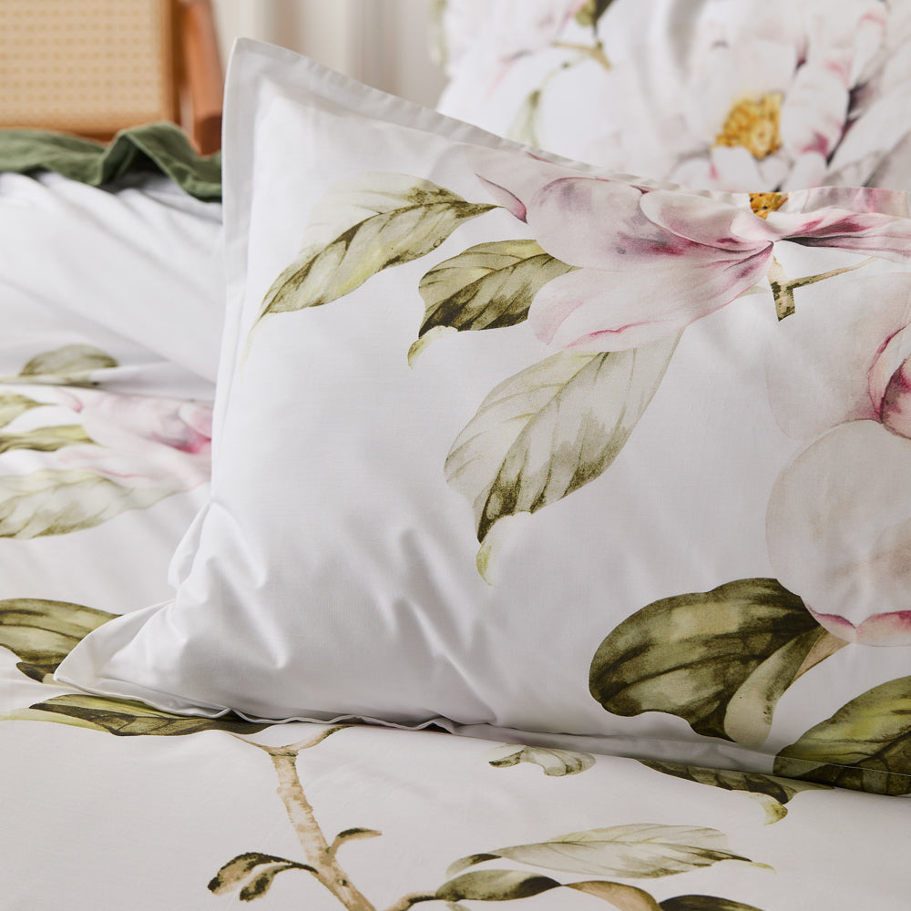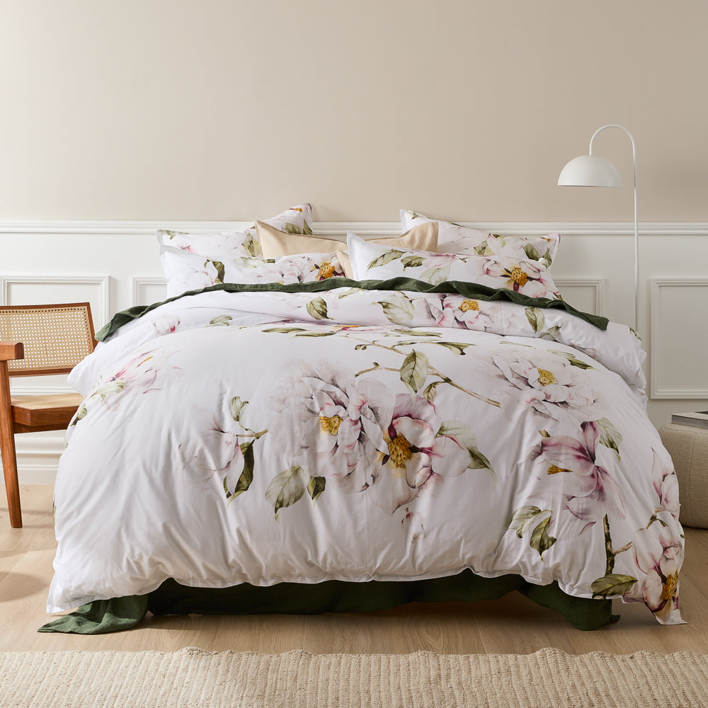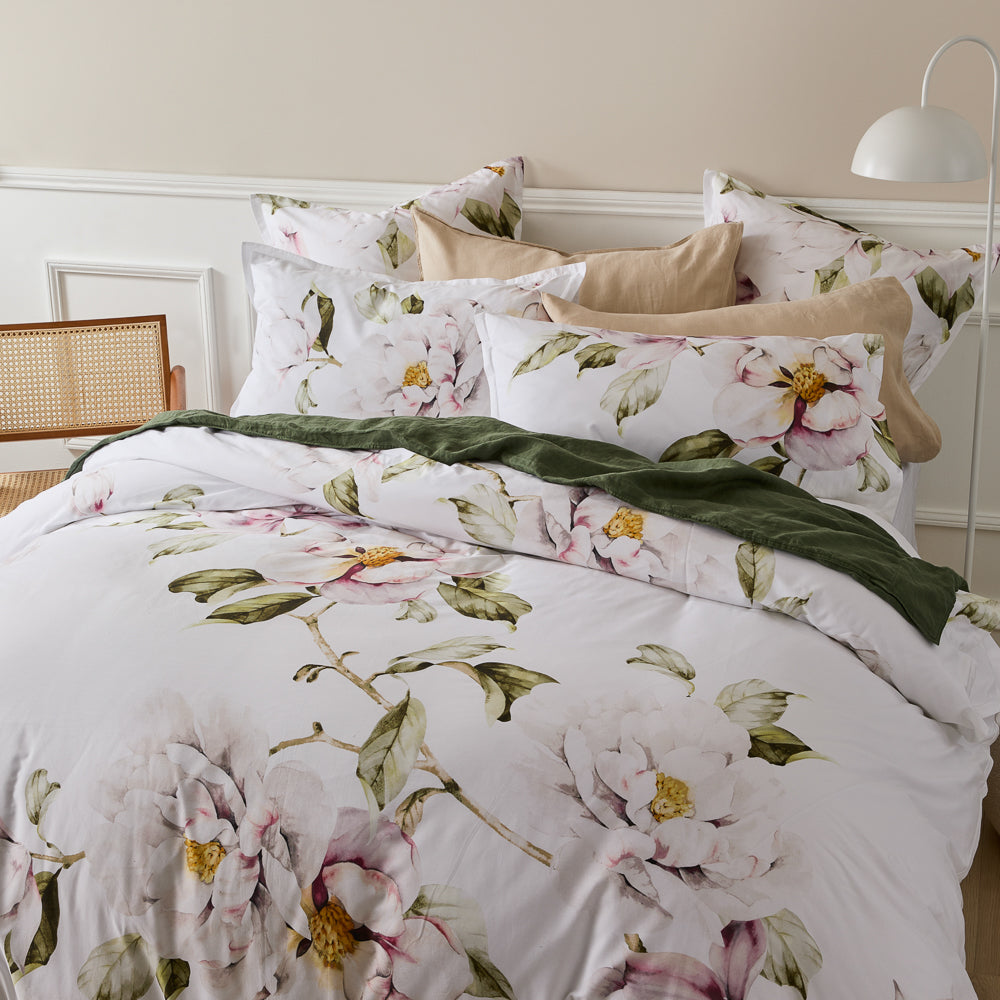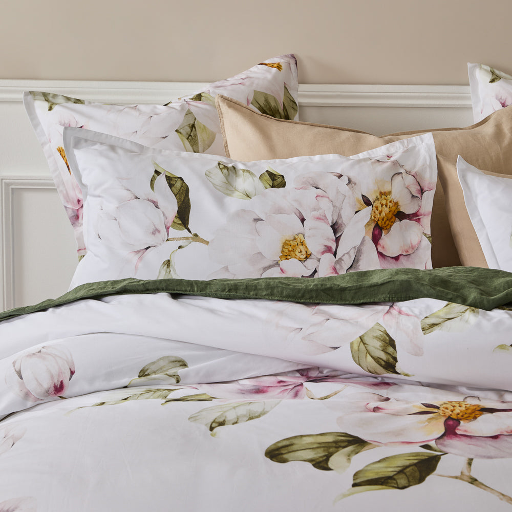 The Amour Quilt Cover Set is a stunning addition to your bedding collection. This beautiful quilt cover set features a delicate floral design, hand-painted by local Australian artists. Hints of pink and green add a subtle drop of colour atop the clean white backdrop. Printed onto luxurious cotton sateen, this set offers a comfortable and indulgent feel for a restful night's sleep. The intricate detail of the artwork is showcased in the design, which boasts a 2 cm flange edge for a touch of sophistication and style. The reverse side of the quilt cover is a plain, white-coloured cotton percale, offering a clean and fresh aesthetic. The Amour Quilt Cover Set is a versatile and timeless design that will complement any bedroom decor. Style it with its coordinating European pillowcase for a classic look or mix and match with other bedding collections to create a unique and personalised space. Bring an air of soft and graceful elegance to your bedroom with the Amour Quilt Cover Set.