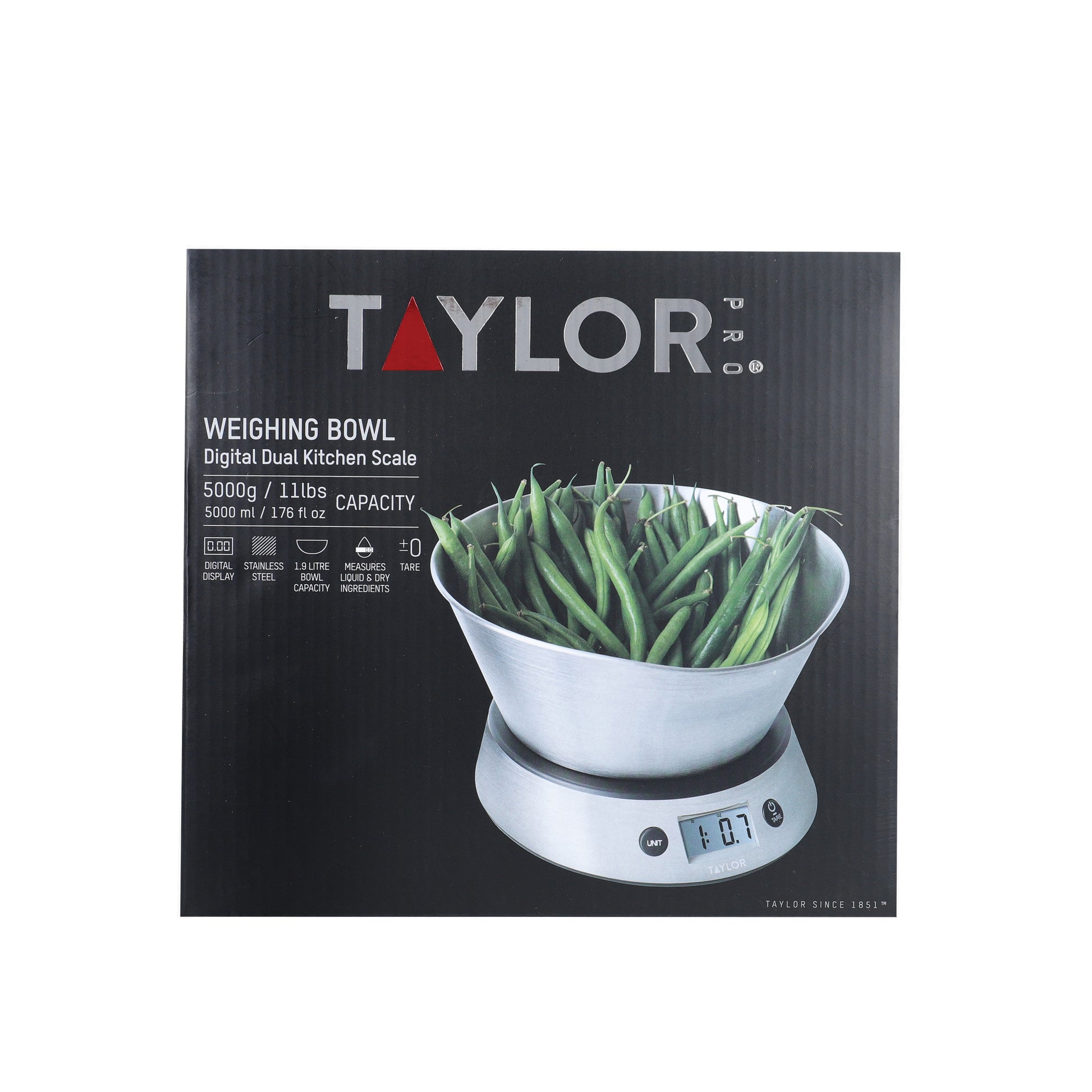 Weigh and mix in the same bowl. The Taylor Weighting Bowl Digital Dual Kitchen Scale feature a sleek but practical brushed stainless steel bowl. Place the bowl on the platform to accurately measure your dry and liquid ingredients. The bowl's durable construction also makes it hardy enough for you to whip, fold, blend and mix them together once measured - for less mess and quicker clean-ups. You don't have to worry about working out the weight of the bowl before measuring. they have tare functionality, so you can zero out the bowl's weight to measure just the ingredients within. These digital kitchen scales with bowl feature a maximum dry capacity of 5,000 g (11 lbs), and a maximum wet capacity of 5,000 ml (176 fl oz). Twenty year guarantee.